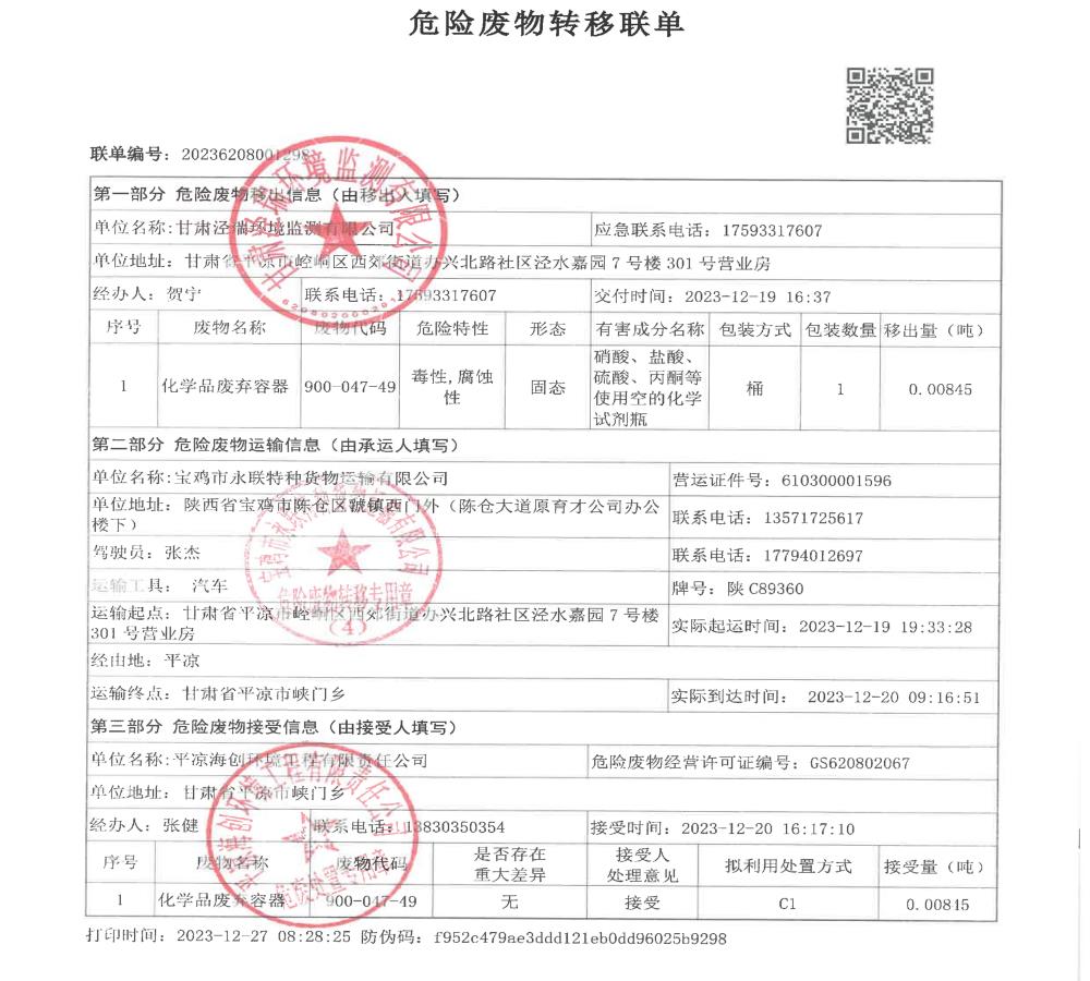 根據(jù)《中華人民共和國固體廢物污染環(huán)境防治法》(2020年9月1日修訂)的相關規(guī)定,甘肅涇瑞環(huán)境監(jiān)測有限公司依法及時公開固體廢物污染環(huán)境防治信息,主動接受社會監(jiān)督。