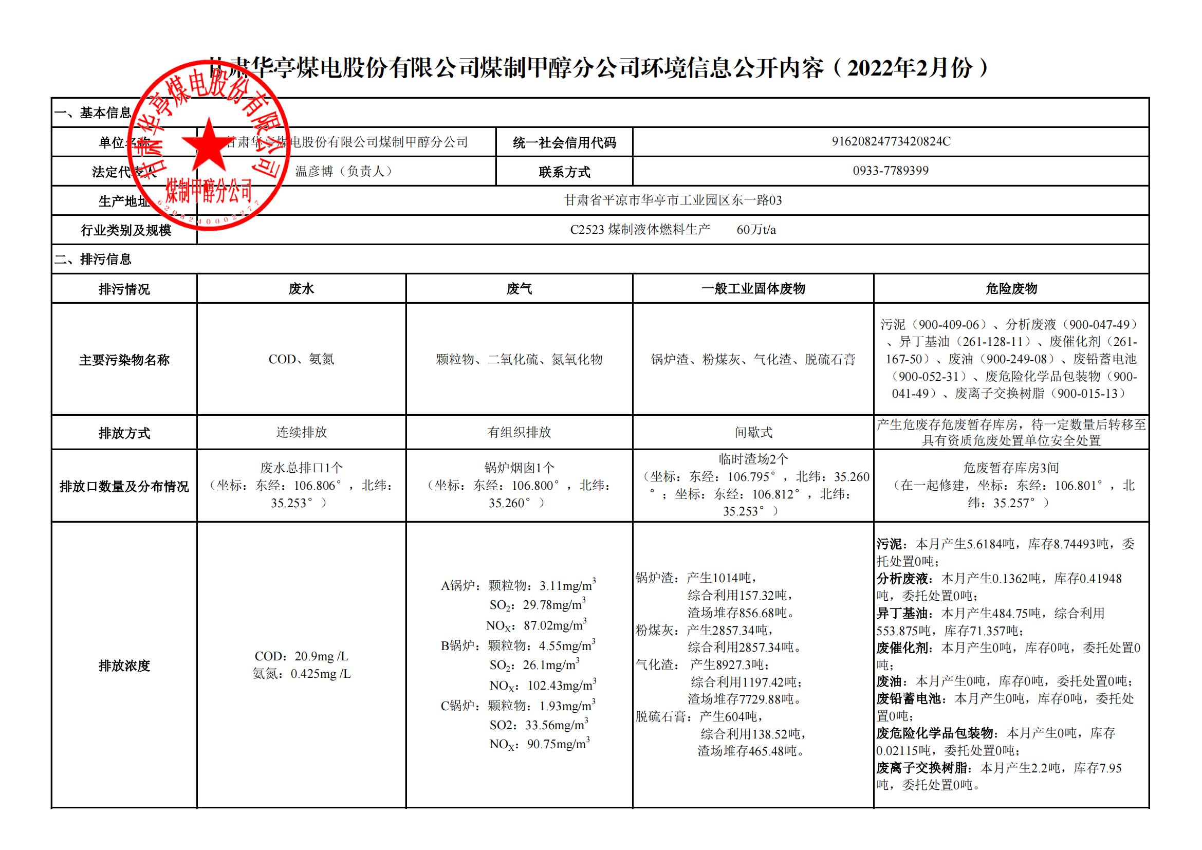 煤制甲醇分公司環(huán)境信息公開內(nèi)容(2022年2月)